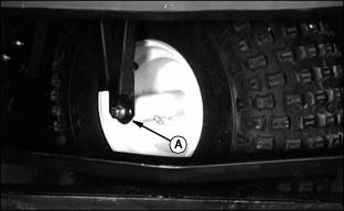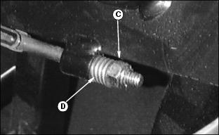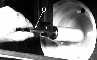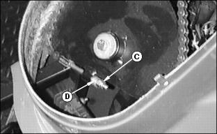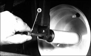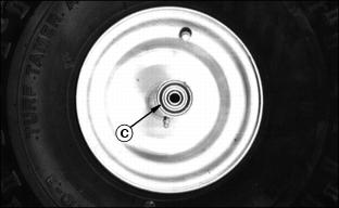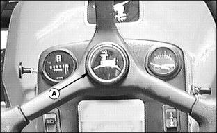 Service Steering & BrakesRemoving Front Wheel1. Remove lock nut (A), one side. 3. Inspect roller bearings (C), both sides, for excessive wear, nicks, burrs, etc. Replace if necessary. 4. Install threaded axle (B) and tighten lock nuts torque to 33 N·m (24 lb-ft.), both sides. NOTE: Overtightening of front wheel bolt may result in bearing damage. Adjusting Steering Chain1. Remove steering wheel, by first prying off the John Deere emblem (A). 2. Unscrew the nut from the steering column and pull steering wheel up and off of the column. 3. Remove two screws (B) and tilt the dash forward. 4. Tighten nut (C) so spring (D) is collapsed, then back out the hex nut 3 flats, this keeps the steering tight. 5. Reverse assembly from above and torque steering column nut to 33 N·m (24 lb-ft.). |