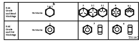 SpecificationsEngineFuel SystemElectrical SystemCapacitiesTransaxleTravel SpeedsSteering and BrakesDimensionsTiresRecommended Lubricants(Specifications and design subject to change without notice.) Metric Bolt and Cap Screw Torque ValuesMetric Bolt and Cap Screw Torque Values (Continued)Metric Bolt and Cap Screw Torque Values (Continued)DO NOT use these values if a different torque value or tightening procedure is given for a specific application. Torque values listed are for general use only. Check tightness of fasteners periodically. Shear bolts are designed to fail under predetermined loads. Always replace shear bolts with identical grade. Fasteners should be replaced with the same or higher grade. If higher grade fasteners are used, these should only be tightened to the strength of the original. Make sure fasteners threads are clean and that you properly start thread engagement. This will prevent them from failing when tightening. Tighten plastic insert or crimped steel-type lock nuts to approximately 50 percent of the dry torque shown in the chart, applied to the nut, not to the bolt head. Tighten toothed or serrated-type lock nuts to the full torque value. a "Lubricated" means coated with a lubricant such as engine oil, or fasteners with phosphate and oil coatings. "Dry" means plain or zinc plated without any lubrication. b Grade 2 applies for hex cap screws (not hex bolts) up to 152 mm (6-in) long. Grade 1 applies for hex cap screws over 152 mm (6-in) long, and for all other types of bolts and screws of any length. Unified Inch Bolt and Cap Screw Torque ValuesUnified Inch Bolt and Cap Screw Torque Values (Continued)Unified Inch Bolt and Cap Screw Torque Values (Continued)DO NOT use these values if a different torque value or tightening procedure is given for a specific application. Torque values listed are for general use only. Check tightness of fasteners periodically. Shear bolts are designed to fail under predetermined loads. Always replace shear bolts with identical grade. Fasteners should be replaced with the same or higher grade. If higher grade fasteners are used, these should only be tightened to the strength of the original. Make sure fasteners threads are clean and that you properly start thread engagement. This will prevent them from failing when tightening. Tighten plastic insert or crimped steel-type lock nuts to approximately 50 percent of the dry torque shown in the chart, applied to the nut, not to the bolt head. Tighten toothed or serrated-type lock nuts to the full torque value. a "Lubricated" means coated with a lubricant such as engine oil, or fasteners with phosphate and oil coatings. "Dry" means plain or zinc plated without any lubrication. b Grade 2 applies for hex cap screws (not hex bolts) up to 152 mm (6-in.) long. Grade 1 applies for hex cap screws over 152 mm (6-in.) long, and for all other types of bolts and screws of any length. |