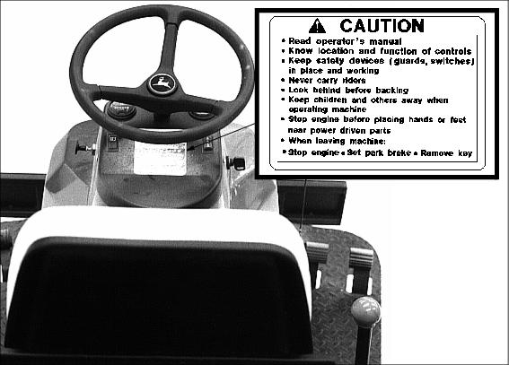 Safety SignsSafety-Alert SymbolRead and recognize safety information. Be alert to the potential for personal injury when you see this safety-alert symbol. On your machine safety labels, the words DANGER, WARNING, and CAUTION are used with this safety-alert symbol. DANGER identifies the most serious hazards. In this manual, the word CAUTION and this symbol call attention to safety messages. Machine Safety Labels |