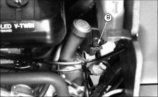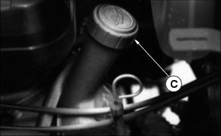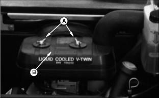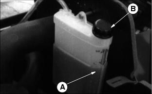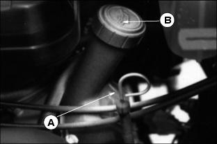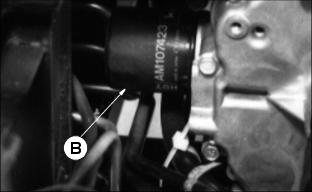 Engine OilUse oil viscosity based on the expected air temperature range during the period between oil changes. The following oil is preferred: Other oils may be used if they ˇ API Service Classification SG ˇ API Service Classification SF Checking Engine Oil1. Park vehicle on a level surface. 2. Check engine oil level before running machine, when oil is cold and maximum drain back has occurred. 5. Check oil level on dipstick. 6. Oil level should be between FULL mark "H" and LOW mark "L" on dipstick 7. If oil level is low, remove oil filler cap (B). 8. Add oil to bring oil level no higher than the "H" mark on dipstick. (See ENGINE OIL in this section for correct oil.) 10. Install and tighten oil filler cap. Changing Engine Oil And Filter