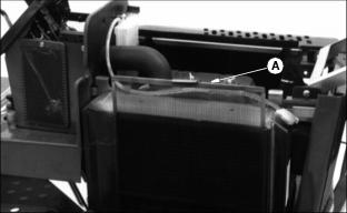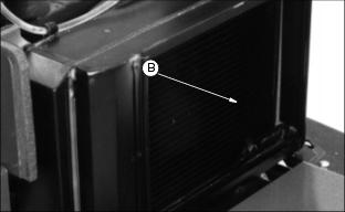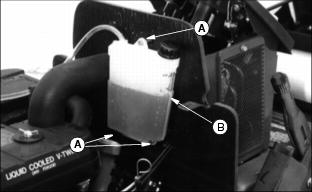 Mix approximately 50 percent antifreeze with 50 percent distilled or deionized water. This mixture will provide freeze protection to -37 degrees C (-34 degree F). The recommended antifreeze provides: ˇ Corrosion-resistant environment within the cooling system. ˇ Compatibility with cooling system hose and seal material. ˇ Protection during cold and hot weather operations. Checking Coolant Level2. Coolant level MUST BE within WARM and COOL marks on recovery tank. 3. If coolant is low, remove coolant recovery tank cap (A). 4. Mix 50 percent ethylene glycol antifreeze with 50 percent distilled or deionized water. 5. Add mixture to coolant tank. 6. Install and tighten coolant recovery tank cap. 7. Clean debris from air intake screen and radiator. (See Clean Air Intake Screen and Radiator this section.) 8. Check condition of hoses. Check for leaks or loose connections Cleaning Air Intake Screen And Radiator4. Clean screen with a brush or compressed air. 5. Clean radiator cooling fins (B) using compressed air or a brush. Draining Cooling System1. Stop the engine. Let the engine cool. 4. Slowly remove radiator cap (A). 5. Open radiator petcock (B). Drain coolant into a bucket. 6. Flush cooling system if necessary (See Flushing Cooling System in this section). 7. After all coolant has drained, close radiator petcock. 8. Fill cooling system (See Filling Cooling System in this section). Flushing Cooling System1. Fill cooling system with clean water and PT500 John Deere Cooling System Cleaner, or PT592 John Deere Cooling System Quick Flush or an equivalent. Follow the directions on the can. 2. Install and tighten the radiator cap. 3. Start and run the engine until it reaches operating temperature. 4. Drain the cooling system immediately before rust and dirt settle. (See Draining Cooling System in this section.) 5. Remove three recovery tank screws (A) and recovery tank (B). 6. Remove tank cap and clean recovery tank. 8. Check condition of coolant system hoses and clamps. 9. Install new hoses if necessary. 10. Fill cooling system. (See Filling Cooling System in this section.) Filling Cooling System1. Mix 50 percent antifreeze with 50 percent distilled or deionized water. (See Engine Coolant section for type of antifreeze.) 2. Add mixture to radiator. Install and tighten radiator cap. 3. Run engine until it reaches operating temperature. 5. After engine cools, check coolant level in recovery tank (A). Level in recovery tank should be between WARM and COOL marks. 6. Remove cap (B) to add coolant mixture if necessary. 7. Check condition of coolant system hoses and hose clamps. Replace if necessary. Checking And Cleaning Air Cleaner Elements