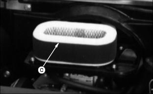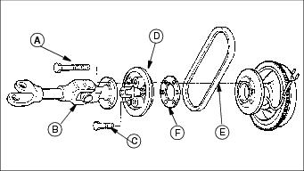 2. Remove two wing nuts (A) and cover (B). 4. Check precleaner for dirt and dust. If precleaner (D) is dirty, remove from paper element (E) and clean as follows ˇ Wash precleaner in warm, soapy water. ˇ Rinse precleaner in clean water. ˇ Squeeze precleaner to remove most of the water. ˇ Apply 30 mL (1 oz.) of clean engine oil to precleaner. ˇ Squeeze precleaner to distribute oil evenly and remove excess oil. 5. Check air cleaner paper element: ˇ If paper element is dirty, tap gently on your hand to remove dust. ˇ If the element is oily or very dirty or damaged, install a new element. 6. Install precleaner on paper element. 7. Install air cleaner and cover. Replacing Fuel Filter1. Stop the engine. Let it cool. 2. Close fuel shut-off valve (A). 3. Squeeze and slide hose clamps (B) away from fuel filter (C). 4. Remove hoses from fuel filter (D). NOTE: Be sure arrow on fuel filter is pointed in the direction of fuel flow. 5. Connect hoses to new filter. 6. Squeeze and slide clamps over hoses against filter. Tightening Or Replacing Fan Belt2. Remove both engine spark plugs NOTE: Rotate driveshaft for access to bolts, if necessary. 3. Remove three bolts (A) to disconnect driveshaft (B). 4. R remove three bolts (C) to remove outer sheave (D). 5. Remove belt (E) if it is to be replaced. NOTE: To allow sheaves to fit closer together and increase belt tension, remove shim (F). Save spacer to use when new belt is installed. 6. Remove spacer shim (F) if belt is to be tightened. Leave spacer in if installing a new belt. 7. Loosely install belt between sheave halves and start installing the three outer sheave-retaining bolts. 8. Rotate sheave assembly as bolts are tightened to allow belt to center in sheave halves and not be pinched in an OFF- CENTER position. Adjusting CarburetorNOTE: Carburetor is calibrated by the engine manufacturer and should not require any adjustments.