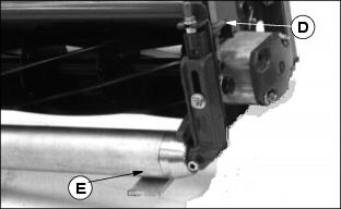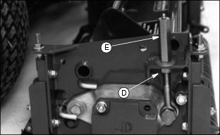 Backlapping cutting units must be done on a routine basis to prolong reel life, prevent downtime, and provide sharp cutting action. 1. Set Park brake and start engine. 2. Lower all cutting units to the ground. NOTE: Cutting units are backlapped all at once. 3. Lift the left access cover to expose the Backlapping valve. 4. Position machine in backlapping mode by pulling up on the Forward/Reverse knob (A). 5. The PTO switch (B) can now be pulled up to ON while the operator is on or off the machine. The reels will turn backward. 6. Rotate the flow control knob (C) to adjust the reel speed. Turn the knob clockwise to decrease the reel speed, counterclockwise to increase reel speed. 7. Adjust reel speed slowly enough so grinding compound will not be thrown off during backlapping. 8. Using a long haired brush, carefully apply reel sharpening compound, uniformly, from one end of the reel to the other. Repeat application in opposite direction. Allow unit to continue running backwards until reel is quiet. 9. Periodically disengage PTO switch and shut engine off to visually check blade appearance. 10. Adjust reel-to-bed knife clearance by loosening jam nut (D) and turning adjusting nut (E) and jam nut (D) to proper clearance on both ends. 11. Check for uniform clearance across entire bed knife. If clearance is not uniform, repeat Steps 6-10 until clearance is uniform across entire bed knife.