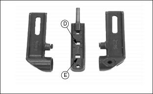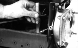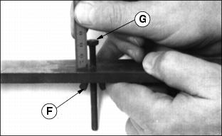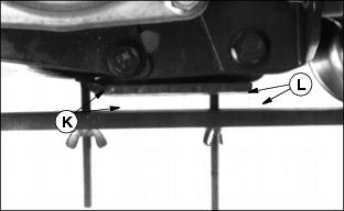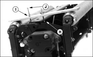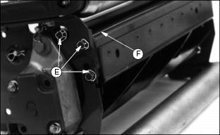 5. Readjust reel-to-bed knife clearance. Adjusting Height-Of-CutNOTE: All cutting units must be set at the same height to obtain an even cut. Floating units will not provide a quality cut in grass over approximately 38 mm (1-1/2 in.) tall. 1. Adjust reel-to-bed knife. See adjusting reel-to-bed knife in this section. 2. Raise cutting units or remove as desired. NOTE: Rear rollers come from factory set and leveled at 19 mm (3/4 in.) cut. If rollers are adjusted to a position so gauge bar cannot be installed, raise either the front or rear roller or both to allow installation of the gauge bar. ˇ Loosen bottom adjusting nuts (B). ˇ Turn top adjusting nut (C) clockwise on each end of cutting unit, alternating back and forth. 5. If adjustment is limited by slots at (A) then raise or lower each adjuster one notch as needed to every adjuster Adjusters MUST be installed with carriage bolt in top hole (D) (stud end) for H.O.C. lower than 38 mm (1.5 in.). NOTE: Each notch in the adjuster rack equals 3.2 mm (1/8 in.). Set rear roller first and then front roller. Height-Of-Cut has two general height settings 9.5-41 mm (3/8-1-5/8 in.) and 38-89 mm (1-1/2-3-1/2 in.). ˇ Adjusters MUST be installed with carriage bolt in the bottom hole (E) for H.O.C. greater than 1.5 in. (See front roller instruction sheet for hole selection.) NOTE: Using a single-bolt adjusting gauge bar will not insure parallelism between rollers and may result in uneven height-of-cut. 6. Loosen wing nut (F). Set height-of-cut by measuring from the top of the gauge to the bottom of the head of the bolt (G). 8. Hook head of bolt (H) over edge of bed knife. (Cutting unit is upside down for photo clarity.) 9. Loosen wing nut (I). Turn bolt (J) until gauge is parallel with bed knife. Measure distance between front (K) and rear (L) of the bottom of the bed knife to top of gauge. Distance should be the same. NOTE: When adjusting rollers, move both ends of roller equally, alternating from end to end. This will keep the adjusters from binding 10. Loosen top adjusting nuts.