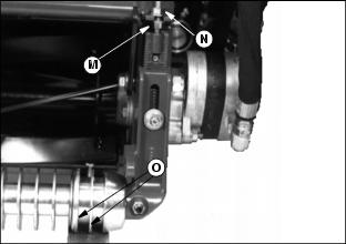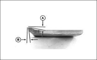 11. Grooved rollers: Carefully turn bottom adjusting nut (M), after loosening top nut (N), until the first 2 ribs (O) of the machined portion of the roller just touches the gauge. This is determined by turning the roller and listening for the scratching sound from roller on gauge bar. ˇ Solid rollers: Carefully turn bottom adjusting nut (D) until the solid center piece of the roller (E) (not the end caps) just touches the gauge. This is determined by turning the roller and listening for the scratching sound. ˇ Rollers with scrapers: A screwdriver can be inserted in slot in scraper, lifted up, and screwdriver handle hooked under reel housing NOTE: Cutting units with no front roller (fixed position) set rear roller only. 12. After setting front and rear rollers on one end, lock jam nuts and recheck all gauge settings. Readjust if necessary. 13. Follow same procedure for the other end of bed knife and rollers. 14. After setting second end, go back and check first settings to be sure they haven't moved. Readjust if necessary. Gauge can snugly be placed into position on either end when properly adjusted. Adjusting Reel-To-Bed Knife ClearanceThis adjustment, combined with the backlapping operation, will ensure a clean cut as well as reduce wear, take less power, and reduce down time. Reel-to-bed knife clearance should be checked BEFORE and AFTER backlapping. 1. The cutting edge of the bed knife must be sharp and straight, and the relief angle should be 5 degrees (A) as shown. Otherwise, remove bed knife and bed knife support and have them ground as a complete unit. 2. Use feeler gauges to set recommended reel-to-bed knife clearance (B) in the range for the grass to be cut. Finer textured grasses, such as rye grass or bent grass requires a close setting, but the setting should not be less than 0.05 mm (0.002 in.). They also require a sharp reel and bed knife to cut properly. 3. Place a 0.05 mm (0.002 in.) feeler gauge (A) between bed knife and reel. Check at both ends of reel and two areas near the center. 4. If adjustment is necessary, loosen jam nut (B) and adjusting nut (C) at both ends of the reel, equal amounts, preferably one flat at a time. 5. Turn adjusting nuts (C) clockwise to raise reel. ˇ Turn jam nut (B) clockwise to lower reel. Adjust reel until 0.05 mm (0.002 in.) is reached across the entire reel and bed knife. 6. Tighten adjusting nuts (C) and jam nuts (B). Recheck to insure reel has not moved. Readjust if necessary.