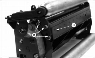 14. With reel stopped, use water to thoroughly wash off all reel sharpening compound. Readjust Reel-To-Bed Knife ClearanceSee Adjusting Reel-To-Bed Knife Clearance in this section. Grinding The Bed KnifeNOTE: Bed knife removed for illustration purposes only. When grinding the bed knife, it is important to have a 5 degree relief angle on top surface (A) and front surface (B). Replacing Bed Knife1. Remove six cap screws (A) attaching bed knife support to cutting unit housing, (three on each end). 2. Remove bed knife support, with bed knife attached from cutting unit housing. 3. Remove and discard screws and nuts attaching bed knife to support. Discard bed knife. 4. Remove debris, corrosion, and rust from bottom surface of bed knife support. 5. Install end screws (B), tighten to secure knife to support, to properly position knife. 6. Install rest of screws and nuts. 7. Torque nuts to 1/2 torque, approximately 26 Nˇm (19 lb-ft), starting from the center and work out towards the ends. 8. Finish torquing to full torque, 51 Nˇ m (38 lb-ft), starting from the center and work out towards the ends. Minimum torque is 45 Nˇm (33 lb-ft). 9. Put bed knife support and bed knife in a suitable grinder and grind until knife is flat and uniformly ground across the top surface. 10. Raise reel by turning the reel adjusting nut (C) clockwise and nut (D) counterclockwise until the knife and support can be installed. 11. Reinstall the bed knife support assembly and snug cap screws (E) on both ends. 12. Tap both ends of bed knife (F) away from reel with a brass hammer to remove any play in bed knife support. Tighten cap screws to 43 Nˇm (32 lb-ft). 13. Set the height-of-cut. (See Adjusting Height-Of-Cut in this section.) 14. Adjust the reel-to-bed knife. (See Adjusting Reel-To-Bed knife in this section.) 15. Backlap reel. (See Backlapping Cutting Units in this section.) 16. Check the height-of-cut and adjust as necessary. (See Adjusting Height-Of-Cut in this section.) |