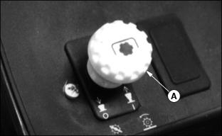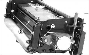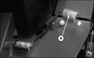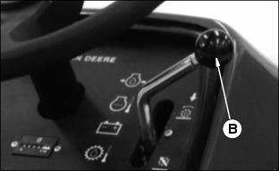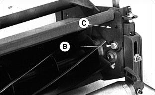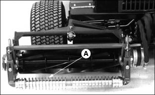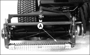 3. Remove 1/2 x 1 in. cap screw and nut from FIXED position (C). Install NOTE: Cutting grass under 38 mm (1-1/2 in.) in dry conditions a grooved roller may be desirable. NOTE: In wet/muddy conditions or in new growth areas a smooth roller may be the choice. Grass DeflectorThe cutting units come with a grass deflector mounted on the rear of the cutting units. NOTE: For ease of changing, the bent end of rod (A) should be located opposite the motor end of the cutting units. With the deflector (B) down as shown the grass will be deflected towards the front of the cutting units. Remove pull pin (C) and rod (A) and move deflector (B) up, to position shown for rear discharge of grass clippings. Replace rod (A) and pull pin (C). Engaging Reel Drive1. Pull PTO switch (A) up to the ON position. 2. Move throttle all the way forward to fast (r) position. 3. Slowly push pedal (A) down to begin forward mowing. 4. Push lift/mow lever (B) forward to LOWER cutting units and start reel rotation. ˇ Pull lift/mow lever (B) back to RAISE cutting units and stop reel rotation. Hold in this position until the rear cutting unit is fully raised. ˇ Remove foot from pedal (A) to stop forward travel. Dismounting To Inspect Or Unplug ReelsNOTE: If engine and cutting units are running, engine and cutting units will stop when operator lifts off seat, if the park brake is not set. 3. Push PTO switch down to the OFF position. |