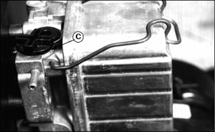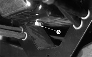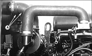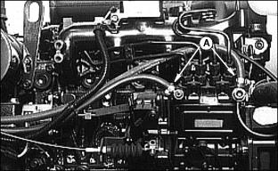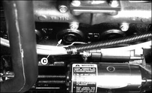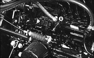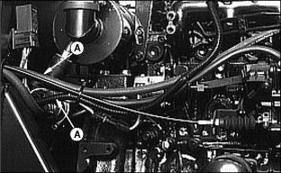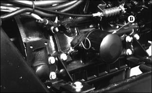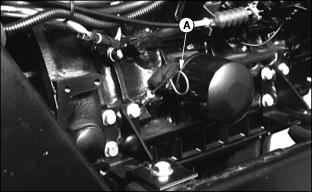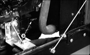 6. Install primary element and Draining Water From Fuel Filter/Water Separator3. Fasten plastic tube (A) to drain tube on bottom of filter/separator. Put tube in container. 7. Drain about one-half cup of fuel, drain fuel until fuel looks pure, or drain fuel until water-in fuel light goes out. 8. Tighten drain plug (B) and air vent plug (C). Replacing Fuel Filter/Water SeparatorNOTE: :Install new fuel filter after 200-Hours of operation or yearly, whichever comes first. Replace filter when there is little fuel in tank. 2. Raise hood. See Raising Hood in this section. 3. Turn air vent plug (A) counterclockwise to open vent. 4. Fasten drain hose (C) to drain tube. 5. Turn drain plug (B) counterclockwise. Drain all fuel from water separator into a container. 6. Release clamps to remove separator. 7. Install new separator. Fasten using clamps. Bleeding Fuel System1. Fasten clear drain hose to vent pipe (A). 2. Loosen air vent plug on top of fuel filter/water separator. 3. Turn key to ON. Let fuel pump fill filter/separator. Close air vent when fuel flows out of vent. 5. Tighten screw when fuel begins to flow from around bleed screw. Injection Pump And NozzlesChanging the injection pump in any way not approved by the manufacturer will end the warranty. See your copy of the John Deere warranty on this machine. Do not service an injection pump that is not operating correctly. See your John Deere distributor. If injection nozzles are not working correctly or are dirty, the engine will not run normally. See your John Deere distributor. Replacing Thermostat1. Stop engine and lock parking brake. Raise hood. Let engine cool. 3. Open radiator drain, see Draining, Flushing, and Filling Cooling System in this section. Drain coolant into a container. 4. Remove two cap screws (A) from thermostat housing. 5. Remove thermostat and gasket. 6. Install new thermostat and gasket. Wax bulb on thermostat should be turned toward the engine. Gasket mounting surface must be clean. 7. Install and tighten cap screws. 9. Fill radiator with coolant. Install and tighten radiator cap. Tightening Air Intake Hose ClampsTightening Cooling System Hose ClampsTighten radiator hose clamps (A). Tightening Fuel Hose ClampsChecking and Adjusting Belt TensionCheck alternator belt after first 10 hours of operation and every 50 hours thereafter. 1. Push on belt halfway between pulleys. 2. Belt should deflect 13 mm (1/2 in.) with 95 N (20 lb) force. 3. Loosen cap screw and apply pressure to front alternator frame only. |
