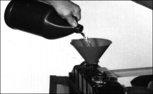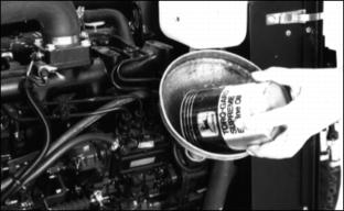 1. Fill cooling system with clean water and cooling system cleaner. Follow directions on can. 2. Fill coolant tank half full. 3. Install and tighten radiator cap and coolant tank cap. 4. Start and run engine until operating temperature is reached. 5. Open both drains. Drain the cooling system immediately before rust and dirt settle. Filling Cooling System