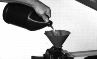 3. Check oil a few minutes after engine has been shut off. 4. Remove dipstick (A). Wipe with a clean rag. Install dipstick. 6. Oil must be between ADD and FULL marks. 7. If oil level is low, remove oil filler cap. Add oil to bring oil level no higher than FULL mark on dipstick. See Engine Oil in this section. Changing Engine Oil And Filter2. Run engine a few minutes to warm oil. 4. Remove drain plug (A) on bottom of engine block. 5. While oil is draining, change engine oil filter. 7. Turn filter (B) counterclockwise to remove. 8. Apply a film of clean oil to new filter gasket. 9. Install filter. Turn filter until gasket contacts mounting surface. Turn filter by hand 1/2 turn more. 10. Install and tighten drain plug. 11. Remove filler cap. Add 5.8 L (6 qt) of oil. See Engine Oil in this section. 12. Install cap. Run engine. Check for leaks around filter and drain plug. Stop engine. Check oil level. Service Cooling System SafelyEngine CoolantUse ethylene glycol base coolant. These coolants usually have labels stating "For Automobile and Light Duty Service." These products are also often labeled for use in aluminum engines. Check container label before using.