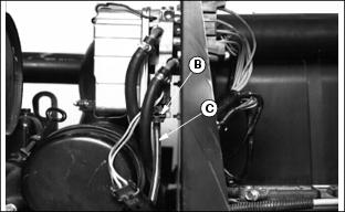 Draining Cooling System1. Stop engine and lock parking brake. 2. Raise hood. Let engine cool. 4. Open radiator drain cock (B). Drain coolant into a pan. 5. Remove block drain plug (C). Drain coolant from engine block. 6. After all coolant is drained, tighten radiator drain cock and block drain plug. 7. Remove coolant tank cap on front of radiator support. 8. Remove tank and empty coolant. 9. Install tank on radiator support. Flushing Cooling System
