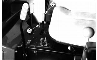 Backlapping cutting units must be done on a routine basis to prolong reel life, prevent downtime, and provide sharp cutting action. 1. Set parking brake and start engine. 2. Lower all cutting units to the ground. 4. Pull up interlock switch (A), located under seat. 5. Move backlapping switch (B) to "N" (neutral position) for backlapping. Set throttle (C) on low idle. NOTE: Cutting units may be backlapped separately. Left thumbscrew controls the left cutting unit. The center thumbscrew controls the right cutting unit. The right thumbscrew controls the three remaining units. 7. Turn thumbscrews (D) inward (clockwise) to turn reels in reverse and adjust speed. Thumbscrews are located on right side, behind fuel tank, and below battery. ˇ Reels must be turning backwards slowly enough so grinding compound will not be thrown off during backlapping. 8. Using a long-handled brush, carefully apply reel sharpening compound, uniformly, from one end of REEL to other. Repeat application in opposite direction. Allow unit to continue running backwards until reel is quiet.