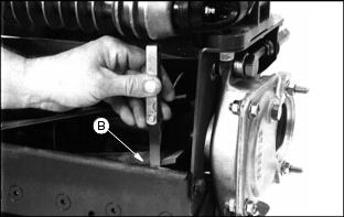 When cutting grass taller than approximately 38 mm (1-1/2 in.), the front roller tends to knock down grass affecting the quality of cut. In these conditions, it may be necessary to operate with cutting units in fixed position. NOTE: This is recommended for smooth areas only, such as athletic fields, level parks, etc. 2. Remove scraper, if equipped. 3. Move cap screw, washer, and nut to fixed position (B). Grinding The Bed KnifeNOTE: Bed knife removed for illustration purposes only.