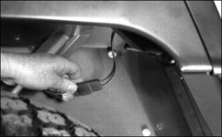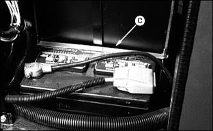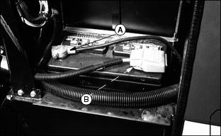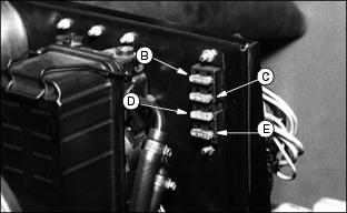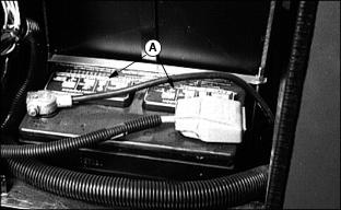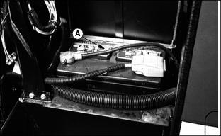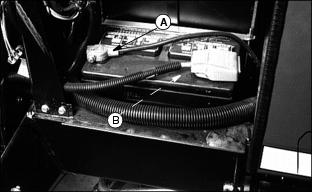 4. Clean battery using a damp cloth or rag. Keep dirt out of 5. Remove corrosion from terminals and cable clamps using a wire brush. 6. If battery is extremely dirty or needs replacing, remove battery hold-down (C) and remove battery. 7. Clean battery, battery terminals, cable ends, hold-down parts, and battery box with 1 part baking soda to 4 parts water. Keep solution out of battery cells. 8. Rinse all parts with clean water and let dry. NOTE: If a new battery is needed, install a John Deere battery or an equivalent. See your John Deere distributor. 9. Install battery and secure using hold-down. 10. Connect positive (+) cable (D) to battery (shown). 11. Connect negative (-) ground cable (E) to battery. Connections must be tight. 12. Apply petroleum jelly on battery terminals to prevent corrosion. 13. Check cell caps. Vent holes must be open. Replacing Fender HeadlIght1. Disconnect wiring couplers. 2. Remove three screws and headlight. 3. Install new headlight with screws (A). Replace FusesA 10 amp fuse (A) is located on the instrument panel and is in the circuit with the power assist rear wheel drive. Four blade-type fuses are part of the electrical system. The fuses are located on the engine fire wall. Replacing Fuses (Continued)B - 25 Amp Fuse: Control Module |