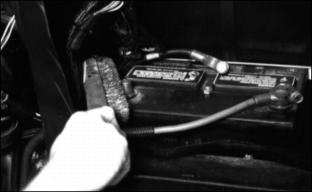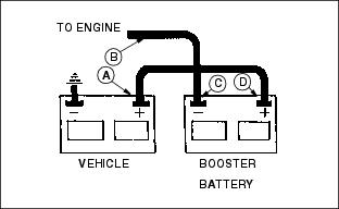 3. .Electrolyte (C) should be 1/4 in (6 mm) above plates (D). 4. Add distilled water if necessary. 5. Install manifold caps. Be sure manifold cap hose is behind positive cable. Charging The BatteryFollow instructions on the battery charger or in the charger operator's manual, or use the instructions below as a guide. ˇ Wait until the battery has warmed to room temperature. Do not charge a frozen battery. ˇ Check the electrolyte level of each cell. (See Checking Battery Electrolyte Level in this section.) ˇ Install the battery cap(s) on the battery. Turn OFF and unplug the charger before you connect cables to the battery or disconnect cables from the battery. If the battery becomes warm to touch during charging: ˇ Stop charging the battery until it cools. Charging The Battery (Continued)1. Remove and clean battery. (See Cleaning Or Replacing Battery in this section.) 2. Check electrolyte level. (See Checking Battery Electrolyte Level in this section.) 3. Leave cell caps on battery while you charge it. 4. Connect positive (+) charger cable to positive (+) battery terminal. 5. Connect negative (-) charger cable to negative (-) battery terminal. 7. Charge battery. See CHARGING RATES on the next page. 8. Unplug charger cord. Remove charger cables. Charging RatesSee your battery charger or charger operator's manual for information on charging. Or read the information below to FULLY CHARGE your battery. For a charger with a CURRENT ADJUSTMENT CONTROL: ˇ Adjust the control to 10 amps. ˇ Charge the battery for 6-8 hours. For a charger with a switch for MAINTENANCE FREE, DEEP CYCLE, or NORMAL (CONVENTIONAL) setting: ˇ Use the MAINTENANCE FREE or DEEP CYCLE setting. For a charger with SLOW CHARGE, FAST CHARGE, or BOOST CHARGE setting: ˇ DO NOT use the BOOST CHARGE setting. ˇ Use the SLOW CHARGE setting: ˇ - For a charger rated at less than 10 amps. ˇ Use the FAST CHARGE setting: ˇ - For a charger rated at 10 amps. NOTE: NOTE: Your charger may have an AUTOMATIC STOP to prevent charging the battery: ˇ When the battery is fully charged OR ˇ When the battery is not in condition to take a charge. Using Booster BatteryConnect positive (+) booster cable to booster battery positive (+) post (D). Connect the other end of positive (+) booster cable to vehicle battery positive (+) post (A). Connect negative (-) booster cable to booster battery negative (-) post (C). Connect the other end of negative (-) booster cable to engine ground (B) away from battery. Cleaning Or Replacing Battery1. Stop engine. Lock parking brake. Remove key. Raise hood. 2. Disconnect negative (-) ground cable (A) first. 3. Disconnect positive (+) cable (B).