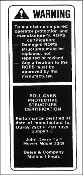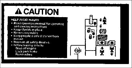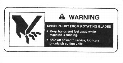 Safety SignsSafety-Alert SymbolRead and recognize safety information. Be alert to the potential for personal injury when you see this safety-alert symbol. On your machine safety labels, the words DANGER, WARNING, and CAUTION are used with this safety-alert symbol. DANGER identifies the most serious hazards. In this manual, the word CAUTION and this symbol call attention to safety messages. Machine Safety LabelsPicture Note: On Both Sides of Cutting Units Machine Safety Labels (Continued)Certification LabelThis machine has been tested and evaluated by the manufacturer and conforms to rotary mower requirements of the American National Standard B-71.4.1990 for Commercial Turf Care Equipment Safety Specification. |