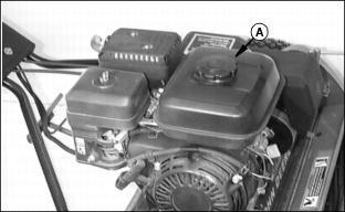 · Use only clean, fresh, unleaded regular grade gasoline. · Remove any trash from top of fuel tank drain area. · Never use fuel that is stale or has been stored for a long period of time: Warm Weather: Maximum 60 days. Cold Weather: Maximum of 90 days. · Fill fuel tank at the end of each day's operation. This helps to keep condensation out of fuel tank. Oxygenates (either ethanol or MTBE) are added to the gasoline. If you use the oxygenated fuel be sure it is unleaded and meets the minimum octane rating requirement. The following are the EPA approved percentages of fuel oxygenates: ETHANOL (Ethyl or Grain Alcohol): You may use gasoline containing up to 10 percent ethanol by volume. MTBE (Methyl Tertiary Butyl Ether): You may use gasoline containing up to 15 percent MTBE by volume. METHANOL (Methyl or Wood Alcohol): You may use gasoline containing up to 5 percent methanol by volume, as long as it also contains cosolvents and corrosion inhibitors to protect the fuel system. Gasoline containing more than 5 percent methanol by volume may cause starting and/or performance problems. It may also damage metal, rubber, and plastic parts of your fuel system. Filling Fuel Tank (Continued)1. Wipe dust and dirt from around fuel cap (A) and remove cap. 2. Fill fuel tank at the end of each day's operation: · Fill to bottom of filler neck to allow room for gas to expand.