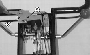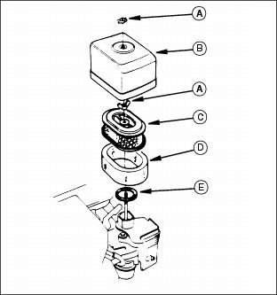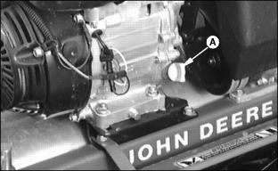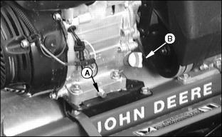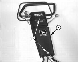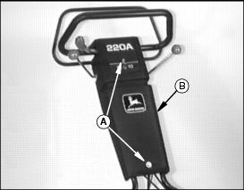 · Fuel tank capacity: 2.5 L · Install fuel tank cap and tighten. Adjusting Throttle Lever Location1. Remove two bolts (A) (10 mm). 2. Remove handlebar cover (B). 3. Loosen two nuts (C) (10 mm). 4. Move throttle lever plate (D) to where the throttle lever location is most comfortable to the operator. 6. Install handlebar cover with two bolts and tighten. Adjusting Throttle Lever Tension1. Remove two bolts (A) (10 mm). 2. Remove handlebar cover (B). 3. Using two wrenches, tighten or loosen the lock nut (C) on the throttle pivot bolt (D). At the proper tension, the throttle lever is easy to move, yet maintains the desired throttle setting during operation. 4. Install handlebar cover with two bolts and tighten. Cleaning Air CleanerNOTE: Clean and oil every 25 hours under normal conditions. If used under very dusty conditions, clean once a day or every ten hours. 1. Remove wing nut (A) to remove air cleaner cover (B). 2. Remove second wing nut (A) to remove air cleaner element (C) and precleaner (D). 3. Check housing, precleaner, element and rubber gasket (E) for damage. Housing must seat well and permit only filtered air to reach carburetor. Replace if necessary. 4. Be sure nothing is obstructing the air passage. 5. Precleaner (D) - Clean every 25 hours of operation: · Wash in detergent and water, rinse in clean water. · Saturate in clean engine oil and squeeze out excess. · Air cleaner element (C) - Clean or replace every 100 hours of operation: · If element is dirty, tap gently on your hand to remove dust. · If element is extremely dirty or damaged, install new element. · Assemble air cleaner assembly and install two wing nuts. Cleaning Fuel Sediment Bowl1. Turn fuel shut-off valve (A) to the OFF position. 2. Unscrew and remove sediment bowl (B) and O-ring (C). 3. Clean thoroughly with John Deere degreasing solvent or equivalent. Checking Engine Oil Level1. Be sure engine is in a level position, if necessary, put a block under front roller to level engine. NOTE: Do not screw dipstick into engine to check oil level. 2. Remove dipstick (A), wipe clean, and insert into filler port. 3. If no oil or only a slight amount is seen, add to full level (B). Do not overflow.(See Engine Oil in this section for correct oil.) Oil capacity: 0.6 L (0.6 U.S. qt). 4. Wipe any spilled oil off mower. Changing Engine OilNOTE: Change engine oil after first 20 hours of operation, then every 50 hours. Check and fill plugs are located in front and rear of machine. 1. Run engine a few minutes to warm oil. 2. Be sure engine is in a level position, if necessary, put a block under front roller to level engine. 4. Remove drain plug (A) and drain oil into container. If necessary, use the optional drain tube to drain oil away from unit. 6. Remove dipstick (A), wipe clean. 7. Add to full level (C). Do not overflow. (See Engine Oil in this section for correct oil.) Oil capacity: 0.6 L (0.6 U.S. qt). 8. Wipe any spilled oil off mower. Cleaning Spark Plug And Adjusting Electrode Gap1. Disconnect plug wire (A) and remove plug. 2. Thoroughly clean plug using high flash-point solvent and wire brush. 3. Inspect plug for cracked porcelain, pitted or damaged electrodes, or other damage. NOTE: In Canada, replace plug with a resistor plug. 5. Check plug gap (B) with a round wire-type feeler gauge.