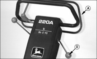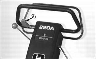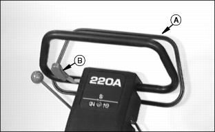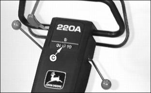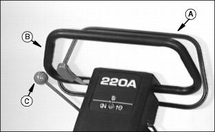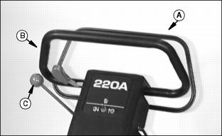 The operator presence bail (A) permits ENGAGEMENT of the Using Travel Clutch Lever (Forward Travel)1. Hold bail (A) to handlebar (B). 2. Push clutch lever (C) FORWARD to ENGAGE drive clutch.