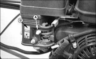 2. Pull throttle lever (B) all the way back (toward operator). Let engine idle 3-5 minutes to allow engine to cool down.