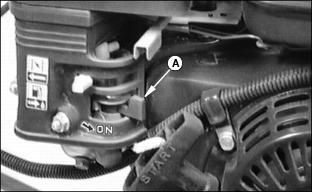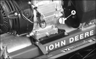 3. Release bail (A) to STOP NOTE: If adjustments are required, see Adjusting Drive Belt in Service - Belt section and Adjusting Bail. Using Park Brake LeverRelease bail (A) and pull brake lever (B) rearward to STOP reel. Using Throttle LeverUse throttle lever (A) to adjust engine speed and rate of travel. Pull lever (A) back (toward operator) to REDUCE engine speed. Adjust throttle lever depending on rate of travel, cutting height, and ground contour. Using Choke LeverMove choke lever (A) toward the decal (B) at right for the CHOKE position. Using Fuel Shut-Off Valve
