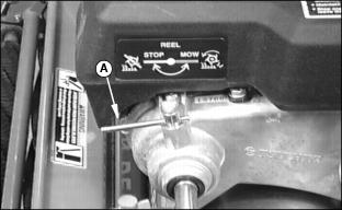 This unit is equipped with a ˇ When performing any type of engine service. ˇ Fuel shut-off valve must be in the full OPEN (ON) position for proper fuel delivery to the engine. Using Reel Clutch HandleNOTE: Use clutch handle (A) only when cutting. Clutch MUST BE at STOP when transporting. Never ENGAGE reel clutch when mower is moving. 1. Clutch handle (A) points toward the HANDLEBAR when at RUN and toward REEL when at the STOP position. 2. Handle will turn 180 degrees from STOP to RUN. Do not turn past the detent positions. NOTE: Reel will turn only when travel clutch lever is ENGAGED and reel clutch handle is in the RUN position.