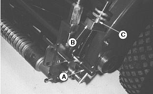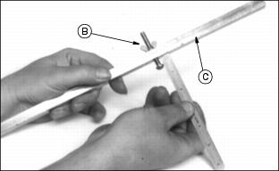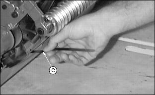 1. To adjust clearance between 2. Turn adjusting handle (B) CLOCKWISE to DECREASE clearance. ˇ Turn adjusting handle (B) COUNTERCLOCKWISE to INCREASE clearance. ˇ Adjust ends of reel to .001" with feeler gauge (C). ˇ Now inspect the entire length of the bed knife with a .002" feeler gauge. It should not go in anywhere. If it does, go to Step 7. ˇ If the reel is contacting anywhere, to to Step 6. NOTE: Always rotate the reel in the reverse direction to avoid damaging or dulling the cutting edges of the reel or bed knife. ˇ Slowly rotate the reel (D) backwards watching for contact between the reel and bed knife at the center of the bed knife. If contact is made, backlap the reel and bed knife to eliminate the "Frown" in the bed knife or the out-of-round condition of the reel.