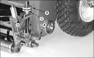 2. Loosen wing nut (B) and set 3. Place gauge (C) against bottom of front and rear rollers and bed knife cutting surface. 4. Move front roller up or down using adjusting knob. 5. Adjust height to gauge (C) by adjusting front roller until knife becomes slightly tight to underside of screw head (D). 7. Check cutting height on both ends with gauge. Readjust height as necessary. 8. Tighten T-handles on both sides. Adjusting HandlebarThe height of handlebar can be adjusted by loosening cap screw (A) on each side of machine. Position handlebar to desired position and tighten cap screw (A). NOTE: Make sure bracket (B) is straight up and down, and not at an angle. Adjusting Bed Knife-To-ReelNOTE: Reel must be free to turn by hand.
