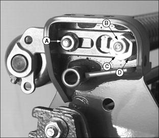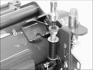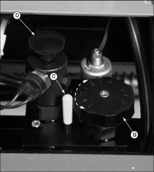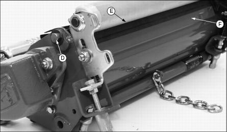 NOTE: To help maintain sharp edges required on cutting reels, bed knife-to-reel clearance should be checked before the backlapping function begins. The bed knife must be adjusted properly to ensure light, even contact over the length of the cutting blades. Cutting reels are all backlapped at the same time. 1. Check bed knife-to-reel clearance on all three cutting reels. Adjust if necessary. (See Adjusting Bed Knife-To-Reel in the Operating-Cutting Units section.) 3. Move mow/transport lever to the TRANSPORT ) position. 5. Lower cutting units to the ground. NOTE: Operator must be off the seat for the backlapping valve to function. 7. Open service access panel (A) below operator seat platform. 8. Locate backlapping valve (B) to the left of the battery. ˇ Position throttle lever between mid-range ) and SLOW ) idle. ˇ Turn reel speed control knob (B) clockwise until indicator (C) is aligned with a number between "1" and "3". NOTE: Forward/Reverse control knob must be pulled up completely past first detent for the backlapping valve to function properly. ˇ Pull Forward/Reverse control knob (D) UP until a click is heard. 12. Move the Mow/Transport lever to MOW ) position. 13. Activate Raise/Lower lever. ˇ Move and hold lever forward. ˇ When cutting reels begin turning in REVERSE, release lever. NOTE: Adjust reel speed slow enough so reel sharpening compound is not thrown off during the backlapping procedure. 14. Using a LONG HANDLED BRUSH, carefully apply reel sharpening compound, uniformly, from one end of the cutting reel to the other. Repeat application in opposite direction. Allow cutting reel to continue running backwards until reel is quiet. 15. Periodically disengage cutting units by moving the Mow/Transport lever to the TRANSPORT )position and turn key switch to the "STOP" position. Visually check blade appearance. NOTE: Forward/Reverse control knob must be pushed down to restart engine. ˇ Check for uniform clearance across entire bed knife. If clearance is not uniform, repeat backlapping procedure until clearance is uniform across entire bed knife.