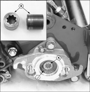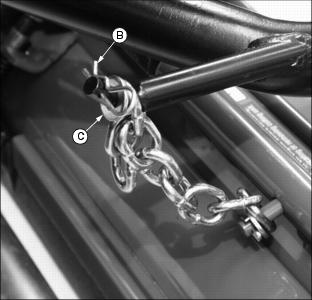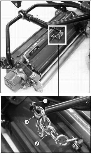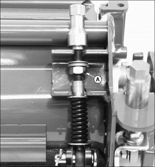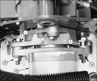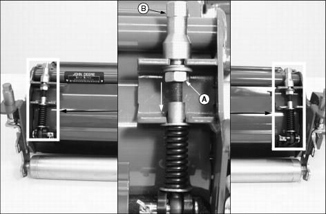 Service - Cutting UnitsAvoid Injury From Contacting BladesRemoving and Installing Cutting UnitsRemoving Cutting Units1. Park greensmower on a hard, level surface. 2. Stop engine and engage park brake. Picture Note: Photo shows front left cutting unit. ˇ Remove spring locking pin (B) and flat washer (C). ˇ Remove chain from lift arm pin. 4. Disconnect yoke (D) from lift arm (E). ˇ Roll cutting unit forward away from lift arm. 5. Remove hydraulic motor (G). ˇ Loosen locking assembly hardware (H). ˇ Rotate motor from reel bearing housing slots (I). 6. Inspect inside of reel bearing housing (J) for grease. Add John Deere Special Purpose HD Cornhead Grease to housing if additional lubrication is needed. 7. Check splined motor/reel coupling (K) for wear. Replace if necessary. Make sure coupling is lubricated with grease and remains in position on reel shaft. 8. Repeat procedure for other cutting units if necessary. Installing Cutting UnitsNOTE: Center cutting unit has the upstop bracket. Right front cutting unit has the steering limiter bracket. 1. Install hydraulic motor (G) onto the reel bearing housing. ˇ Align splined reel coupling with splined motor drive shaft. ˇ Align locking assembly hardware with reel bearing housing slots (I). ˇ Tighten assembly locknuts (H). NOTE: Yoke with steering limiter bracket must be installed to the right front cutting unit. 2. Install yoke (D) to lift arm (E). ˇ Align yoke pin and lift arm mounting holes. ˇ Fasten cutting reel in position with quick-lock pin (F). NOTE: The lift chain has nine links. Assemble seventh link onto lift arm pin. 3. Install lift chain (A) onto lift arm pin. ˇ Install flat washer (C) and spring locking pin (B). ˇ Make sure chain is not kinked. 4. Repeat procedure for other cutting units if necessary. Removing Cutting Unit YokesNOTE: When performing some service and operational procedures it may be desirable to remove the cutting unit yokes. 1. Remove flange head bolt (A), lock nut (B) and two pivot bushings (C) from each end of cutting unit yoke. 2. Install in reverse order of removal. NOTE: Yoke with steering limiter bracket must be installed to the right front cutting unit. Removing and Installing Front RollerRemoving Front Roller1. Remove cutting unit from greensmower. (See Removing and Installing Cutting Units in this section.) 2. Position cutting unit upright on a flat surface or workbench. 3. Loosen and remove hardware from left roller bracket. ˇ Remove flange nut (A) and carriage bolt from lower hole. ˇ Remove lock nut (B), eccentric adjuster (C), serrated washer (D) and carriage bolt. 4. Loosen and remove hardware from right roller bracket. ˇ Remove flange nuts (E) and carriage bolts. 5. Remove roller and bracket assembly from cutting unit frame. Picture Note: Photo shows left roller bracket being removed. ˇ Loosen jam nut (F) and set screw (G). ˇ Remove bracket (H) from each bearing spindle shaft end. Installing Front RollerNOTE: Roller brackets are offset. For standard use, the bracket should be installed to the roller with the offset to the rear of the base cutting unit to allow close proximity of front roller to rear roller. If Greens Tender Conditioner (GTC) is being installed, offset should be to the front to allow the GTC to be installed behind the front roller. Install the roller bracket with the larger holes and adjustment slot on the left side of the cutting unit, in the direction of travel. The roller bearing spindle shaft has holes drilled in each end. DO NOT tighten set screws near the holes. 1. Install roller brackets (A) onto each bearing spindle shaft end. Picture Note: Photo shows left roller bracket being installed. ˇ Install set screws (B) and lock nuts (C) loosely. DO NOT tighten. 2. Select Height-of-Cut (HOC) adjustment range. ˇ Alignment of roller bracket (A) and cutting unit frame (D) adjustment holes will determine HOC adjustment range. ˇ Refer to chart for desired setting. 3. Install front roller and roller bracket assembly. ˇ Slide assembly roller brackets (A) into cutting unit frame slots. ˇ Align selected HOC adjustment holes. NOTE: Install carriage bolts from the inside. ˇ Fasten bottom of LEFT roller bracket to frame using one M8 x 20 carriage bolt and one M8 flange nut (E). Picture Note: Top photo shows installation of left roller bracket. NOTE: Install serrated washer with cupped side facing cutting unit frame. ˇ Fasten top of LEFT roller bracket to frame using one M8 x 40 carriage bolt, one serrated washer (F), one eccentric adjuster (G) and one M8 lock nut (H). ˇ Fasten RIGHT roller bracket to frame using two M8 x 20 carriage bolts and two M8 flange nuts (I). Picture Note: Bottom photo shows installation of right roller bracket. ˇ Tighten roller bracket attaching hardware. NOTE: Make sure the roller bracket set screw locations are not aligned with the holes in each bearing spindle shaft end. Set screws must engage the bearing spindle shaft at each end. ˇ Center front roller. Tighten set screws (B) and jam nuts (C) on both roller brackets.
