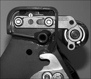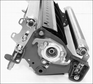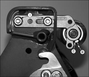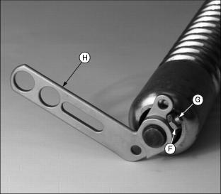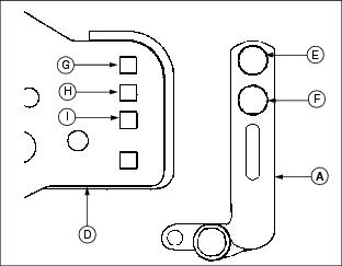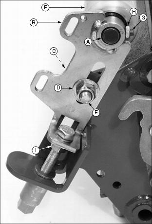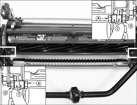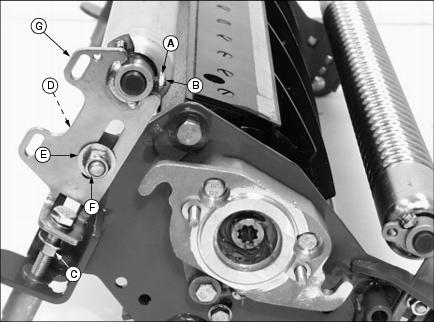 4. Adjust front roller for parallelism (See Adjust Front Roller Parallel with Bed Knife in the 5. Adjust height-of-cut. (See Adjust Height of Cut in the Operating-Cutting Units section.) Removing and Installing Rear RollerRemoving Rear Roller1. Remove cutting unit from greensmower. (See Removing and Installing Cutting Units in this section.) 2. Position cutting unit on a flat surface or workbench. 3. On each side of rear roller, loosen jam nut (A) and set screw (B). 4. Loosen jam nut (C) on each adjuster tower. 5. Remove carriage bolt (D), flat washer (E) and lock nut (F) attaching each height-of-cut (HOC) adjustment bracket (G) to the cutting unit frame. 6. Move height-of-cut (HOC) brackets (G) away from each bearing spindle shaft end. Installing Rear Roller1. Install roller bearing spindle shafts (A) into each height-of-cut (HOC) bracket (B). 2. Attach both height-of-cut brackets to cutting unit frame. NOTE: Install carriage bolts from the inside. ˇ Install carriage bolt (C), flat washer (D) and lock nut (E). 3. Center rear roller (F) inside HOC brackets. 4. Tighten set screws (G) and jam nuts (H). 5. Loosen lock nuts (E) approximately 1/4 turn. 6. Tighten jam nut (I) on each adjuster tower. 8. Adjust height-of-cut. (See Adjust Height of Cut in the Operating-Cutting Units section.) Replacing Bed KnifeRemoving Bed Knife1. Remove cutting unit from greensmower. (See Removing and Installing Cutting Units in this section.) 2. Position cutting unit on a flat surface or workbench. 3. Relieve tension from bed knife tension springs on both sides of cutting unit. ˇ Turn jam nuts (A) counterclockwise until springs are completely compressed. 5. Rotate each adjustment assembly away from reel housing bracket (C). 6. Position cutting unit on flat surface or workbench as shown. 7. Remove shoulder bolt (D) from each end of cutting unit. 8. Slide bed knife assembly (E) out of the cutting unit housing. NOTE: Remove debris, corrosion, and rust from bottom surface of bed knife support. ˇ Remove and discard thirteen screws attaching bed knife to assembly support. Discard bed knife. ˇ Install bed knife using new screws. Alternate tightening by starting with center screws. 10. Put bed knife support and bed knife in a suitable grinder and grind until material is removed from the entire top surface of the bed knife lip. (See Grinding the Bed Knife in this section.) Installing Bed Knife1. Slide bed knife and support assembly (E) into position inside locator shoe (F). 2. Install both shoulder bolts (D). ˇ Tighten hardware to 55 Nˇm (40 lb-ft). 3. Position cutting unit on flat surface or workbench. 4. Install each adjustment assembly inside housing mounting bracket. ˇ Restore bed knife spring tension by turning jam nuts (A) clockwise. Turn jam nuts only midway up the threaded adjustment.
