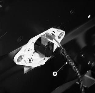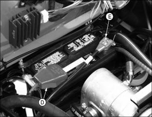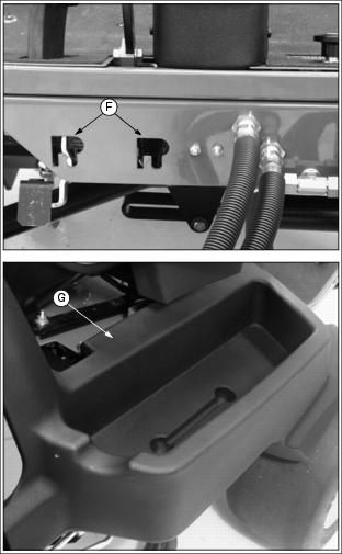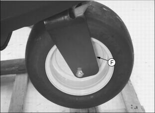 ˇ Install hub (D) onto wheel with four wheel nuts (E). Tighten hardware alternately to 81-95 Nˇm ˇ Install axle (B) through right side of yoke, bushing (C), hub assembly (D), bushing (E) and left side of yoke. ˇ Fasten wheel to yoke with hex nut (A). Tighten hex nut side-to-side to eliminate freeplay. DO NOT overtighten, wheel must have the ability to rotate freely. 6. Lower rear of greens mower. 7. Lubricate steering wheel bearings (F) with John Deere Multi-Purpose HD Lithium Complex Grease or an equivalent. Install Front Drive Wheels1. Loosen four wheel bolts (A) stored in each front drive wheel hub. 2. Remove cap screws (B) and locknuts securing shipping brackets to shipping crate base. 3. Raise front of greens mower with a safe lifting device. 4. Remove wheel bolts (A) and shipping brackets (C) from each front drive wheel hub. ˇ Discard both shipping brackets. 5. Check tire inflation pressure of each front drive wheel. ˇ Keep tire inflated to 69-83 kPa (10-12 psi). NOTE: Make sure each drive wheel valve stem (D) faces to the outside. 6. Install front drive wheels (E). ˇ Install one drive wheel to each hub using four wheel bolts (A). Tighten until snug. 7. Lower front of greens mower. 8. Tighten wheel bolts alternately until recommended torque value is reached. ˇ Tighten wheel bolts to 81-95 Nˇm (60-70 lb-ft.). 9. Install front cutting reel motors into "R" shaped holes (F) stamped in the front of the operator platform. Center cutting reel motor should be laid inside the fuel tank tray (G). 10. Carefully move greens mower off shipping crate base. Install Operator SeatNOTE: For maximum operator comfort, use forward seat pan mounting holes when installing the seat. 1. Connect wire harness (A) to safety switch (B) located under operator seat. 2. Install seat to platform slide rail assembly. ˇ Install rear of seat onto slide rail studs (C). ˇ Fasten rear of seat in position with two 5/16" flanged lock nuts (D). Do not tighten. ˇ Fasten front of seat to slide rail assembly with two 5/16" x 5/8" hex bolts (E). Install Steering Wheel1. Coat splined steering wheel shaft (A) with multi-purpose grease. Picture Note: Pedestal on liquid cooled gas model shown. 2. With rear wheel straight and facing forward, install steering wheel (B) onto the shaft. 3. Install 5/8" hex nut (C) and tighten until snug. Checking and Connecting the Battery1. Adjust operator seat rearward as far as possible. (See Adjusting Seat in the Operating section.) 2. Raise and tilt operator seat (A) forward. Picture Note: Photos show engine compartment in liquid cooled gas model greens mower. ˇ Support operator seat in the raised position with prop rod (B). ˇ Install prop rod in channel slot (C). 3. Check battery electrolyte level. (See Checking Battery Electrolyte Level in the Service-Electrical section.) 4. Connect RED positive (+) cable (D) to battery. Apply petroleum jelly or silicone spray to terminal to prevent corrosion. Make sure connection is tight. Install the red terminal cover. 5. Connect Black negative (-) cable (E) to battery. Apply petroleum jelly or silicone spray to terminal to prevent corrosion. Make sure connection is tight.