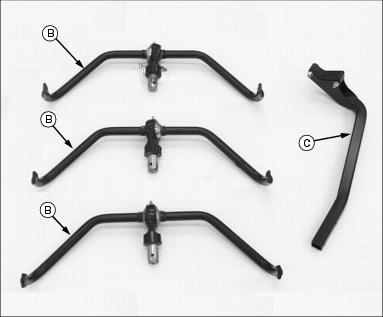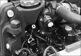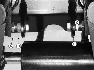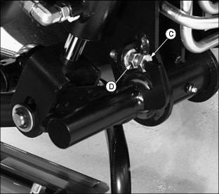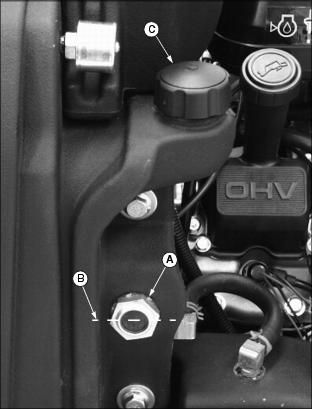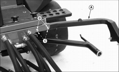 ˇ If the voltage is below 11.6 Volts, charge the battery. (See Charging the Battery in the Install Left Yoke Stop Armˇ Attach yoke stop arm (A) to greens mower foot platform with two M8 x 50 carriage bolts (B) and two M8 flanged hex lock nuts (C). Check Engine Oil LevelPicture Note: Top photo shows engine compartment in liquid cooled gas model greens mower. Picture Note: Bottom photo shows engine compartment in diesel model greens mower. 2. Remove oil dipstick (A). Wipe it clean. 4. Remove dipstick and check oil level. Oil must be between ADD and FULL marks on dipstick. Checking Hydraulic Oil Levelˇ Check oil level on sight glass (A). Oil should be maintained to a mid-level range (B) on the sight glass. Picture Note: Engine area of liquid cooled gas model greensmower shown. ˇ Remove reservoir cap (C). Add oil at reservoir fill cap location until oil level reaches mid-level range on the sight glass. (See Transmission and Hydraulic Oil in this section for the proper oil application.) 4. Install and tighten reservoir cap. Assemble Cutting UnitsThe Model 2500 Tri-Plex Greensmower is shipped from the factory without the cutting units installed. The hydraulic reel motors and cutting reel yokes are shipped with the greensmower. Refer to installation instructions packaged with the cutting units when installing the cutting units and cutting unit yokes onto the greensmower. Retain these instructions with the operator's manual for future reference. Hardware used to install the cutting units and cutting unit yokes onto the greensmower is included in the greensmower parts bag. Hardware must be retained for cutting unit and cutting unit yoke assembly procedures. Check Tire Pressure2. Check tire pressure with an accurate gauge. Check Machine Safety Interlock SystemPerform safety system check to make sure the electronic safety interlock circuit is functioning properly. (See Testing the Safety Interlock System in the Operating Machine section.) Check and Adjust Lift Arm StopsNOTE: Lift arm stop adjustment must be performed when changing tire sizes. Before checking the lift arm stop adjustment: ˇ Reduce inflation pressure in all tires to 69-83 kPa (10-12 psi). Tires are shipped over inflated. ˇ Install all three cutting units. Check Adjustment1. Turn key switch to the RUN position. 2. Push Raise/Lower lever FORWARD to relieve hydraulic pressure in the front and center lift arm cylinders. 3. Push down front and center lift arms. 4. Turn key switch to the STOP position. 5. Measure distance (A) between the center of each yoke ball joint and the ground. ˇ All three yoke ball joints should be 225 5 mm (8.86 in. .20 in.) above the ground with the lift arm down stop plates (B) contacting the stop bolts (C). Picture Note: Bottom left photo shows the front cutting unit lift arm down stop plates contacting the down stop bolts. Bottom right photo shows the center cutting unit lift arm down stop plate contacting the down stop bolt. Adjust Lift Arm Stops1. Loosen stop bolt jam nuts (D). Picture Note: Top photo shows front cutting unit lift arm stop adjustments. Picture Note: Bottom photo shows center cutting unit lift arm stop adjustment. 2. Measure distance (A) between the center of each yoke ball joint and the ground. ˇ Adjust the stop bolts (C) as needed until all three yoke ball joints are 225 5 mm (8.86 in. .20 in.) above the ground. |
