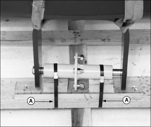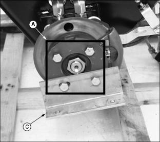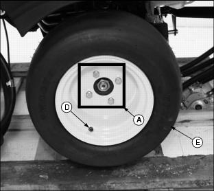 AssemblyIdentify PartsF - Drive Wheels (Smooth Tires Shown) Bag of Parts ListNOTE: The Model 2500 Tri-Plex Greensmower is packaged and shipped from the factory without wheels. Customer will select wheel option preferences at time of purchase. Prepare for Assembly1. Remove greensmower from shipping crate. 2. While positioned on the shipping crate base, attach a safe lifting device to the rear of the greensmower. 3. Cut steel bands (A) securing rear of greens mower to shipping crate pedestal. Install Rear Steering Wheel Assembly1. Remove hex nut (A) securing rear steering wheel hub assembly in position on rear yoke. 2. Lift rear of greens mower with a safe lifting device. 3. Remove axle (B), bushing (C), hub assembly (D) and bushing (E) from yoke. 4. Check rear steering wheel tire inflation pressure. ˇ Keep tire inflated to 69-83 kPa (10-12 psi). 5. Install rear steering wheel. ˇ Remove four wheel nuts from the hub assembly.