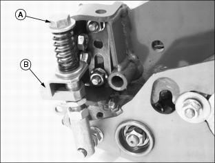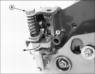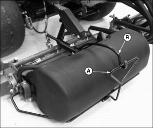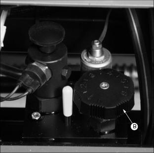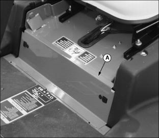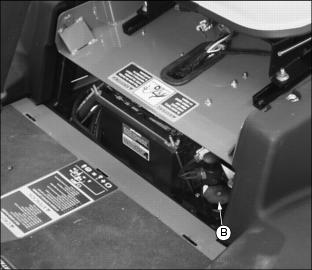 1. Park greensmower on a hard, level surface. 2. Stop engine and engage park brake. 3. Open service access panel (A) below operator seat platform. 4. Locate reel speed control knob (B) behind service access panel. ˇ Reel speed can be adjusted depending on the type of application for the greensmower, which type of cutting units are used, and grass height and conditions. ˇ It may be appropriate to reduce reel speed when cutting taller grass to prevent grass from being blown over and not being cut. Faster reel speeds with dry grass may cause grass clippings to be thrown over the grasscatcher.
