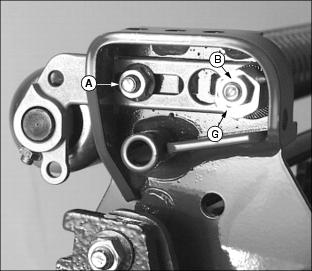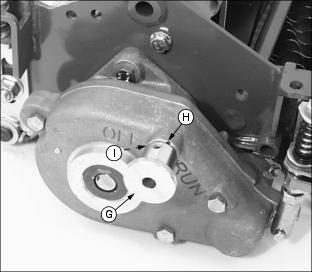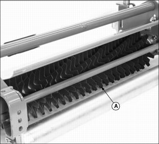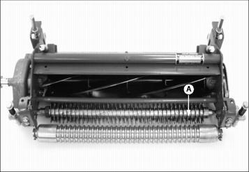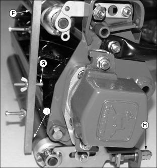 NOTE: It is normal for grass catchers to fill faster when conditioning. Picture Note: Cutting unit shown with seven blade cutting reel and attached conditioner reel (A). 1. Condition greens the first time with blades set the same as Height of Cut. (See Adjust Height Of Cut in this section). Closely examine each green and note any inconsistencies or appearance of over-aggressiveness. Decrease GTC penetration if necessary. 2. Check each green 1-2 hours after cutting. Look for any tendency toward a yellow or brown tint. This indicates over-stress. 3. If visible stress is observed, decrease GTC penetration to 0.39 mm (.016 in.). 4. Continue cutting/conditioning at this setting for three to five days. Check frequently for stress. 5. If no stress is observed, increase GTC penetration by 0.25 mm (0.010 in.). Check for obvious over-aggressiveness. Observe for two to three days, watching for signs of stress. 6. Repeat Step 5, until stress becomes visible. Back off the GTC adjusted penetration by 0.25 mm (0.010 in.). NOTE: Stress is a cumulative result of many factors such as irrigation, temperature, humidity, chemical application, disease, thatch, etc. Conditioning aggressiveness will require adjustment and monitoring as these factors vary. Conditioning frequency may also need to be reduced in some cases. Adjusting (Optional) Greens and Turf ConditionerNOTE: Height Of Cut must be adjusted prior to adjusting the Greens and Turf Conditioner. ˇ Press down on GTC adjuster bolts (A). ˇ Swing adjuster stops (B) around toward the front of the cutting unit. Picture Note: Top photo shows GTC adjuster stop disengaged and out of the operating position. Picture Note: Bottom photo shows GTC adjuster stop engaged in the operating position. 2. Position cutting unit for making height of cut adjustment. (See Adjusting Height Of Cut in this section). 3. Set GTC adjustment screw (C) on the gauge bar to the desired operating height. (See Operating (Optional) Greens and Turf Conditioner in this section). ˇ Adjustment screw (D) may need to be loosened so that the gauge bar can rest on both the front and rear rollers. 4. Place preset gauge bar on cutting unit. Hook height of cut screw (E) on bed knife. The ends should rest firmly on the front and rear rollers. 5. Loosen adjuster lock nut (F) on both ends of the cutting unit. 6. Turn adjuster bolt (A) to raise or lower GTC roll. Alternate from end to end until the teeth touch the screw on the gauge bar. Tighten adjuster lock nuts. ˇ Pull knob (G). Turn knob clockwise to the "RUN" position. Knob must engage detent (H). ˇ Turn knob counterclockwise to the "OFF" position. Knob must engage detent (I). 10. Disengage GTC adjuster stops. ˇ Press down on GTC adjuster bolts (A). ˇ Swing adjuster stops (B) around toward the rear of the cutting unit. Adjusting (Optional) Rear Roller Powered BrushNOTE: It is not necessary to remove the brush cover to adjust the powered brush. 1. Loosen idler gear pivot lock nut (A). 2. Loosen both pivot bracket lock nuts (B). 3. Loosen two flange head cap screws (C) on left side of cutting unit. 4. Loosen two flange head cap screws (D) and nylock nuts (E) on right side of cutting unit. NOTE: The brush bristles should just barely clear the full length of the roller. The gap between the brush bristle tips and the roller should be approximately 1 mm (1/32 in.). 5. Slide the rear roller powered brush (F) up or down to adjust the roller. 6. Tighten flange head cap screws (C) on left side of cutting unit and flange head cap screws (D) and nylock nuts (E) on right side of cutting unit. 7. Tighten both pivot bracket lock nuts (B) and the idler gear pivot lock nut (A). Operating and Adjusting (Optional) Vertical CuttersNOTE: Vertical cutting units (A) are intended for thatch removal and should not be set for ground engagement. The cutters should not be set to penetrate the soil. For excess thatch conditions, several trips across the green may be necessary. DO NOT attempt to remove large amounts of thatch in a single cutting.