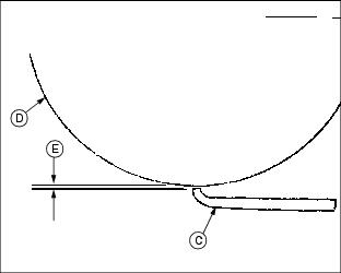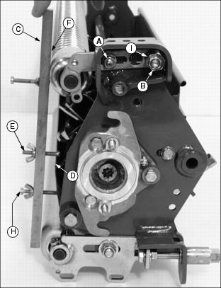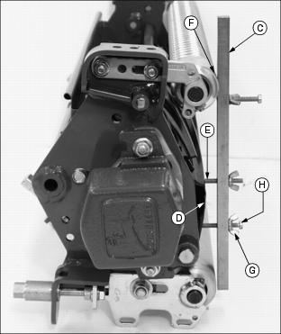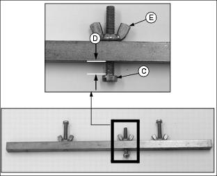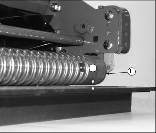 3. Rest HOC gauge bar (C) approximately 51 mm 4. Hook the center gauge screw (E) on the edge of the bed knife. Hold end of gauge bar against the bottom of front roller (F). 5. Loosen wing nut (G). Turn lower gauge screw (H) clockwise until top of screw makes contact with flat edge of bed knife. NOTE: HOC gauge bar should not contact the bottom of the rear roller.