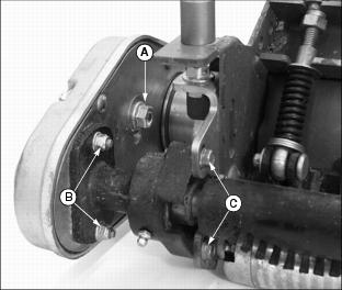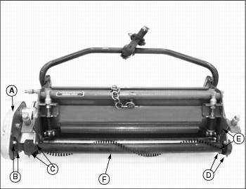 1. Remove cutting reels from greensmower. (See Removing and Installing Cutting Units in the Service-Cutting Units section.) 2. Position cutting unit upright on workbench as shown. 3. On both sides of cutting unit, loosen jam nut (A) and turn bed knife tower adjuster (B) counterclockwise until bed knife (C) is tight against cutting reel (D). 4. Slowly tighten tower adjuster (B) clockwise, alternating from side to side until bed knife begins to pull away from the cutting reel. Cutting reel should rotate freely. NOTE: Make sure that the final adjustment to the bed knife is pulling the bed knife away from the cutting reel. 5. With the use of a feeler gauge, alternately turn adjusters (B) no more than one flat at a time until bed knife to reel clearance (E) measures .025 mm to .050 mm (.001 in. to .002 in.). 6. Tighten jam nuts (A). Check the bed knife-to-reel clearance (E). Adjust again if necessary. Adjust Height Of Cut RangeAdjust front roller brackets for the height of cut (HOC) range desired. ˇ Select height-of-cut (HOC) adjustment range by adjusting the position of both front roller brackets. ˇ Alignment of roller bracket (A) and cutting unit frame adjustment holes (B) on each side of the cutting unit will determine the HOC adjustment range. ˇ Refer to chart for desired setting. Adjust Front Roller Parallel with Bed KnifeNOTE: Use of a bench plate or a two or three bolt height-of-cut gauge bar is recommended when adjusting front roller parallel with the bed knife. Always adjust bed knife-to-reel before adjusting front roller for parallelism. Always make parallelism adjustment after adjusting front roller height of cut range. Parallelism Adjustment with Bench Plate1. Position cutting unit upright on flat surface or workbench. 2. Loosen hex nut (A) and hex nut (B) on the left roller bracket. 3. Set bench plate on a level surface. Set cutting unit on top of bench plate (C). Bed knife (D) must rest firmly against plate stop (E) with cutting reel blade (F) on top of plate stop. 4. Rotate eccentric adjuster (G) until the front roller (H) sits flat and parallel with the bench plate. Gap (I) should not exceed .050 mm (.002 in.) maximum. 5. Tighten left roller bracket hex nut (A). 6. Tighten left roller bracket hex lock nut (B). Parallelism Adjustment with HOC Gauge Bar1. Position cutting unit upright on flat surface or workbench. 2. Loosen hex nut (A) and hex nut (B) on the left roller bracket. NOTE: HOC gauge bar should not contact the bottom of the rear roller.