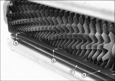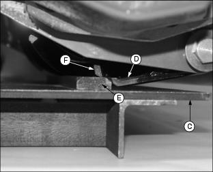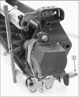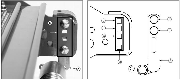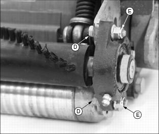 ˇ Adjust mow speed limit to no more than 4.8 km/h ˇ Initial adjustment of blade depth should be flush with the bottom of the rollers. The depth can be increased as needed from this point to achieve desired results. Do not exceed a blade depth of 3 mm (.12 in.). ˇ Before making a vertical cutter adjustment, measure the usable blade length of the cutting blades. If usable blade length is less than the desired cutting depth, replace blades before continuing. Adjusting Cutting Depth1. Mark the desired cutting depth (B) on a gauge bar (C). 2. Place the gauge bar across the front and rear rollers approximately 50 mm (2 in.) in from the end of the rollers. 3. Loosen locknut (D) on each side of the cutting unit. 4. Adjust position of rear roller. ˇ Turn each tower adjuster (E) until leading edge of vertical cutting blade aligns with the cutting depth mark on the gauge bar. ˇ Rotate cutting reel back and forth to ensure blade tip does not extend beyond the depth mark. ˇ Check both ends of cutting reel until they are adjusted to the same setting. ˇ If the vertical cutter cannot be adjusted because of wear, replace the blades and then adjust to the correct depth. NOTE: Adjustment of rubber flap height will depend on turf conditions. ˇ On short turf, lower the flap to prevent material from flying out the rear of the cutting unit. ˇ On turf with a lot of thatch, raise the flap to allow the removed thatch to exit out the rear of the cutting unit. 6. Adjust cutting unit rubber flap (F). ˇ Loosen three carriage bolts (G) and hex nuts. ˇ Adjust the flap approximately 13 mm (1/2 in.) up from the bottom of the rollers. 7. Repeat procedure for other cutting units. Engaging Reel Drive