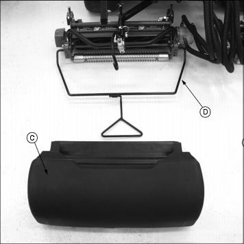 NOTE: The center cutting unit will raise and lower to the ground after the front cutting units. 1. Pull Raise/Lower lever (A) rearward to raise cutting units. NOTE: If the cutting units are lowered to the ground before the Mow/Transport lever is moved to the MOW ) position, the cutting reels will not rotate. Raise the cutting units, move the Mow/Transport lever to the MOW ) position. Lower cutting units to start reel rotation. 2. Move the Mow/Transport lever (B) forward to the MOW ) position. 3. Move the throttle lever (C) forward to the FAST ) position. 4. Slowly begin forward travel. NOTE: The front cutting units lower to the ground before the center cutting unit. Moving the Mow/Transport lever to the MOW ) position activates a switch so the cutting units automatically engage when lowered. 5. Push Raise/Lower lever forward to lower cutting units and start cutting reel rotation. 6. When the front cutting units reach the opposite edge of the green or fairway, pull back the Raise/Lower lever. The cutting units will raise to transport lift height and automatically turn off. Emergency Stopping-Cutting Reelsˇ Cutting reel rotation will stop. To begin cutting reel rotation: ˇ Raise and lower cutting units. 2. Move the Mow/Transport lever to the TRANSPORT ) position. ˇ Cutting reel rotation will stop. To begin cutting reel rotation: ˇ Move the Mow/Transport lever to the Mow ) position. ˇ Raise and lower cutting units. Removing and Emptying GrasscatchersNOTE: Remove center grasscatcher from left side of greensmower. 1. Raise and remove link handle (A) from catcher bracket support hook (B). Picture Note: Top photo shows grasscatcher installed onto the frame assembly. Picture Note: Bottom photo shows the link handle removed from the catcher bracket support hook with the grasscatcher ready for removal from the frame assembly. 2. Remove grasscatcher (C) from frame assembly (D) and empty. |