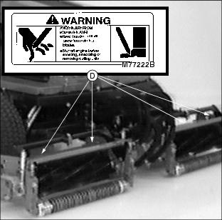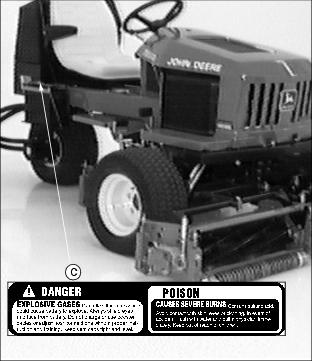 Safety SignsSafety-Alert SymbolRead and recognize safety information. Be alert to the potential for personal injury when you see this safety-alert symbol. On your machine safety labels, the words DANGER, WARNING, and CAUTION are used with this safety-alert symbol. DANGER identifies the most serious hazards. In this manual, the word CAUTION and this symbol call attention to safety messages. Machine Safety Labels(A) Caution:ˇ Know location and function of controls. ˇ Keep safety devices (guards, switches) in place and working. ˇ Keep people at a safe distance away. ˇ Stop engine before placing hands or feet near power driven parts. ˇ Stop engine - Set park brake - Remove key (B) Warning:Machine Safety Labels (Continued)(C) Danger/Poison:EXPLOSIVE GASES: Cigarettes, flames or sparks could cause battery to explode. Always shield eyes and face away battery. Do not charge or use booster cables or adjust post connection CAUSES SEVERE BURNS: Contains sulfuric acid. Avoid contact with skin, eyes or clothing. In event of accident, flush with water and call a physician immediately. Keep out of reach of children. (D) Warning:AVOID INJURY FROM ROTATING BLADES. ˇ Keep hands and feet away from rotating blades. ˇ Shutoff engine before servicing, lubricating or removing cutting units. |