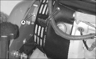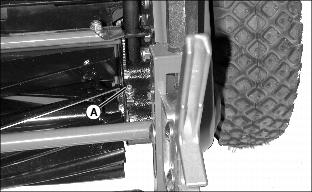 Lubricate reel at point (A) (one each side of mower) with John Deere Multi-Purpose SD Polyurea Grease.