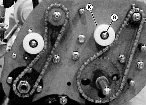 7. Roller Drive Chain: Slide idler (K) back and forth until chain deflects 11mm (7/16-in.) at mid span.