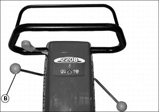 9. With engine running at low idle, hold machine by the handlebars to prevent it from moving. Release the brake and engage the clutch.