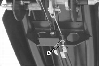1. Loosen upper cable jam nuts (A) and lengthen (decrease belt tension) or shorten (increase belt tension) ferrule length to change belt tension.