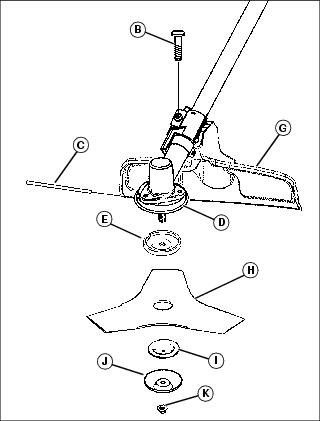 2. Place holding pin (C) through slot in upper flange washer (E) and gear head. Remove blade nut (K), nut guard (J), lower flange washer (I) and blade (H).