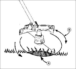 · Keep the trimmer tilted toward the area being cut. See illustration for best cutting area (A). Do not cut in dangerous cutting area (B).