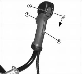 5. Squeeze trigger (F) to full throttle position and hold it, or set the switch (A) to the "START" (fast idle) position (G) and release the trigger.