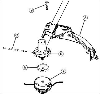 2. Place holding pin (C) through slot in grass cover (D), upper flange washer (E) and gear head. Remove stringhead (F) by turning clockwise.
