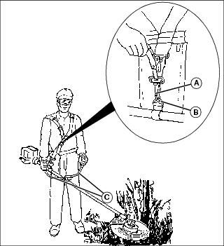 · Before starting the brushcutter, try the fit by engaging the harness spring clip (A) onto the hanger (B) on driveshaft.